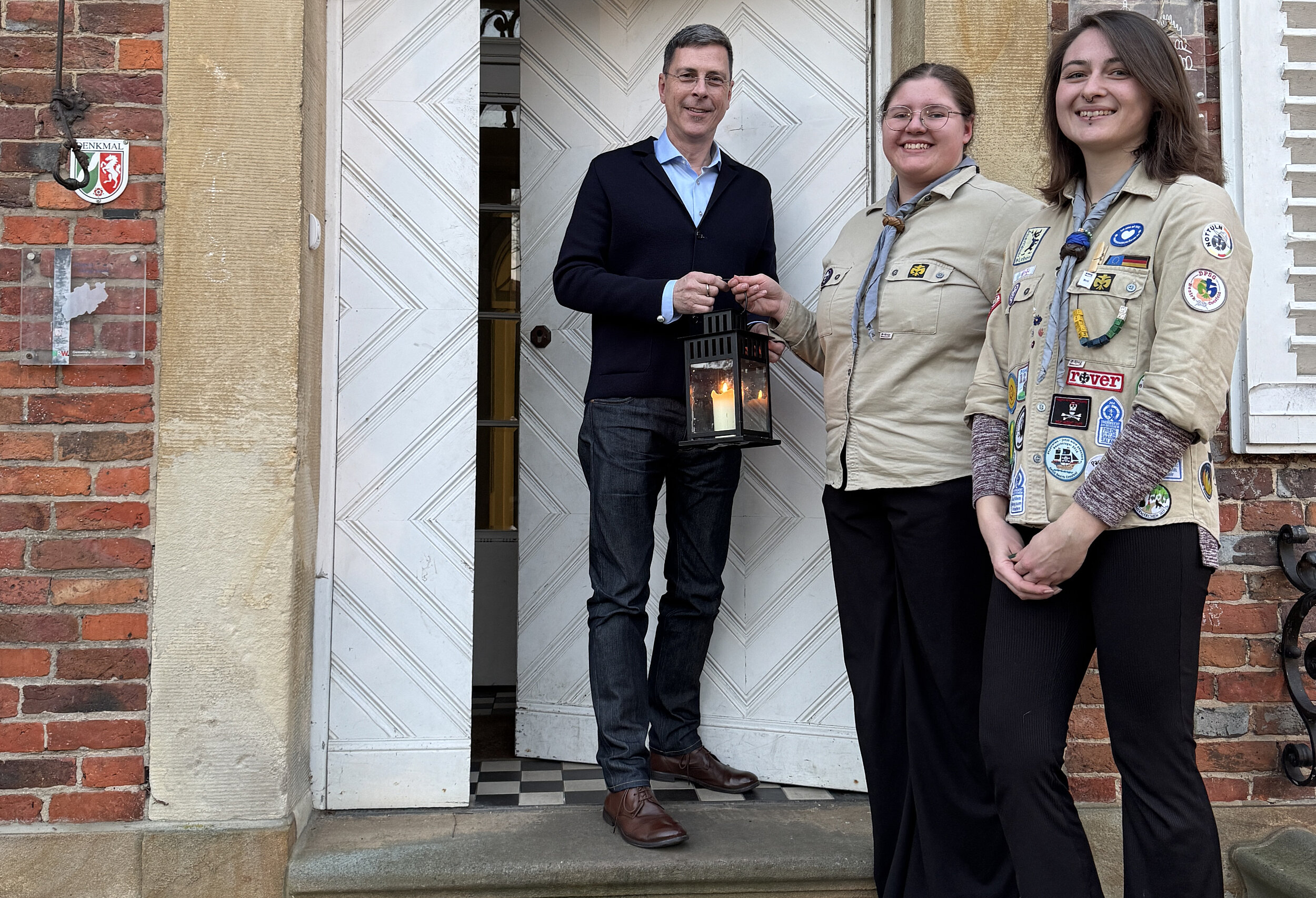Am Montag waren Emmylie Ritzka und Monique Hauling von der DPSG Stamm St. Martin am Nottulner Rathaus, wo sie mit Bürgermeister Dr. Dietmar Thönnes zur Übergabe des Friedenslichtes aus Bethlehem verabredet waren. Nun brennt auch im Rathaus in Nottuln mit der Kerze „ein Funke Mut“.