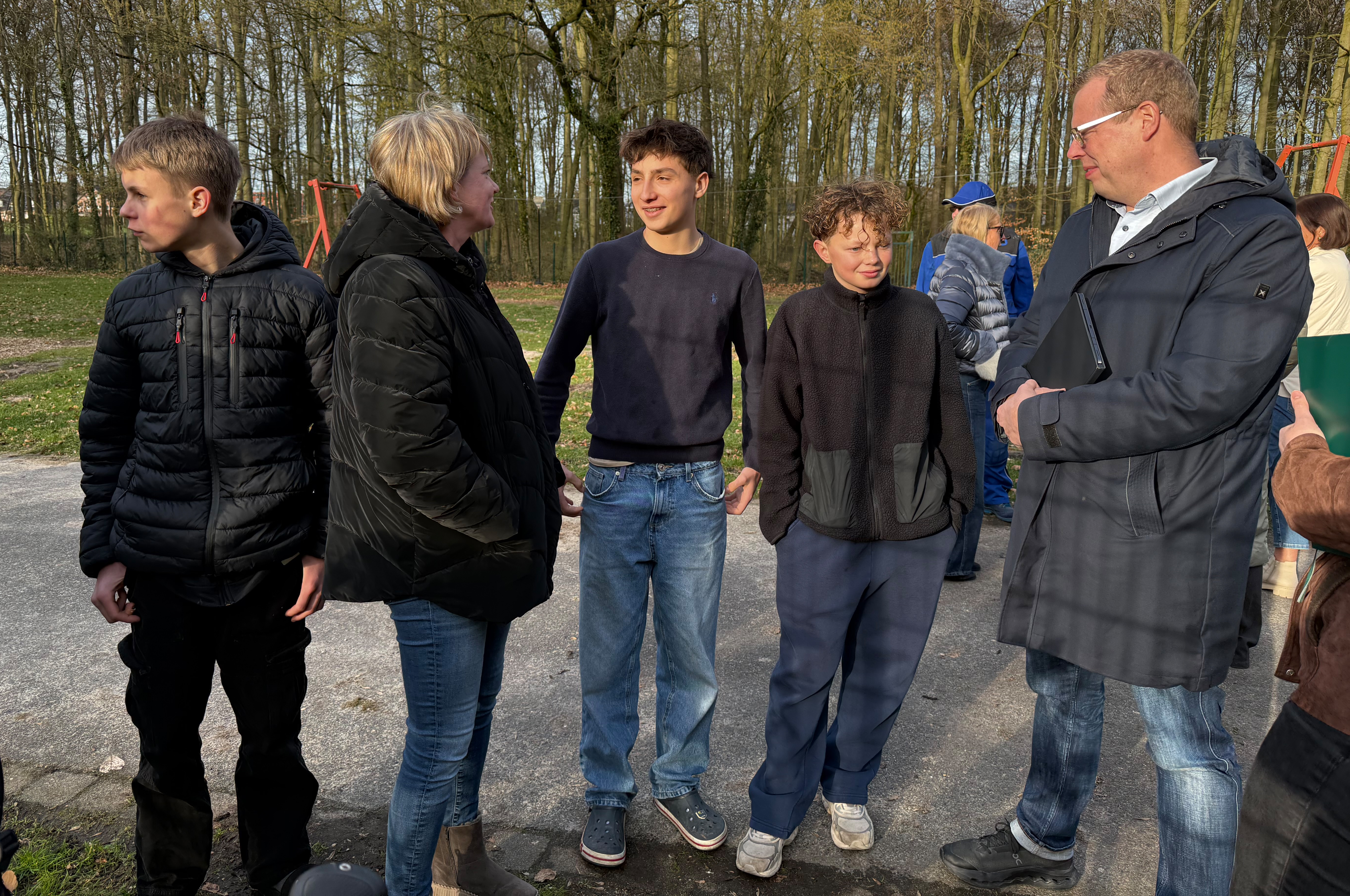 „Es macht uns traurig, was hier gerade passiert. Aber wir bleiben optimistisch, dass der Skatepark gebaut wird“, sagen Lukas, Lasse, Darian und Milo. Sie waren neben weiteren Jugendlichen am Donnerstagnachmittag zu einem Ortstermin mit Anwohner:innen des Waldspielplatzes an der Kolpingstraße gekommen. Und sie waren nicht alleine: Neben rund 20 Anrainer:innen des Spielplatzes nahmen Christoph Bolle, Leiter des Fachbereichs Bauen, Planen, Umwelt, Daniel Krüger, Leiter der Gemeindewerke, Nina Teepe vom Grünflächenamt sowie die Jugendbeauftragte der Gemeinde Nottuln, Daniela Tap, an der rund zweistündigen Veranstaltung teil. Ebenso zahlreiche Kommunalpolitiker und Kommunalpolitikerinnen aller Fraktionen.