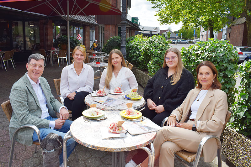 Eis essen mit Bürgermeister Dr. Dietmar Thönnes: Anna Miller (2.v.l.) und Jana Lütteke (3. v.l.) sind die beiden neuen Auszubildenden zur Verwaltungsfachangestellten in der Gemeindeverwaltung. „Das Arbeitsklima stimmt“, sagen sie. Bei ihrer Ausbildungsleiterin Doris Lenfort (r.) sowie bei Justine Pilot (2.v.r.), die im Personalrat der Verwaltung das Amt der Jugend- und Auszubildenden-Vertreterin innehat, finden sie immer ein offenes Ohr. Foto: Gemeinde Nottuln