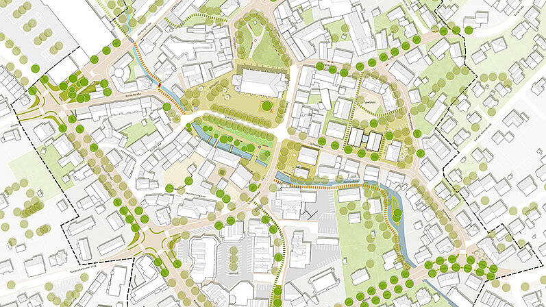 Auf der Basis der vorliegenden Analysen wurde ein Rahmenplan erstellt, der über den Zeitraum des ISEK hinausgeht und die langfristige Entwicklung des Ortskerns bis 2045+ steuert. In diesem → Rahmenplan sind alle Maßnahmen festgesetzt, die zur Entwicklung des Ortskerns Nottuln beitragen sollen.