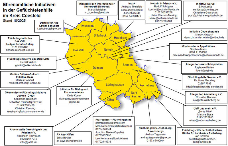 In der unten stehenden Übersicht finden Sie ehrenamtliche Initiativen zur Unterstützung von Geflüchteten im Kreis Coesfeld.